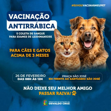 OSVALDO CRUZ - A Prefeitura de Osvaldo Cruz promove nesta quinta-feira, 26 de fevereiro, mais uma ação de vacinação antirrábica para cães e gatos a partir dos três meses de idade. O evento acontece na Praça São José, em frente ao Santuário São José, das 8h às 12h.