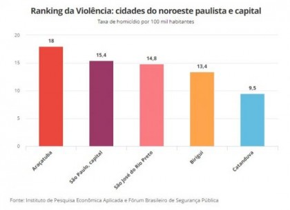 De acordo com o estudo, Araçatuba tem 200.124 habitantes e registrou 36 homicídios, em 2022, um índice de 18,0 mortes violentas por 100 mil habitantes, ocupando a 192ª posição na lista dos 319 municípios mais violentos do país.