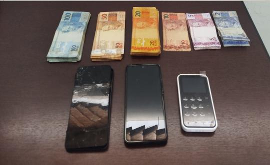 Durante vistoria no carro, os policiais localizaram R$ 6.781,00 em dinheiro, uma máquina de cartão e um segundo aparelho celular. Todo o material foi apreendido.