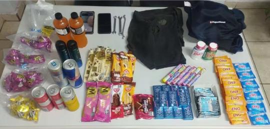 Os agentes notaram que ele havia dispensado os produtos furtados em cima do telhado da farmácia. Ao todo foram apreendidos 28 conjuntos de sal de fruta, 27 chicletes, 11 balas, 11 sorvetes, sete energéticos, quatro chocolates e dois desodorantes.