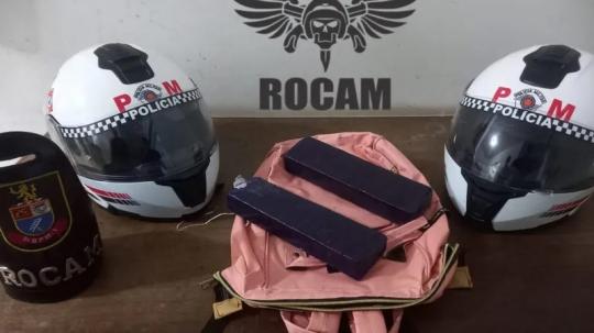 Na porta de uma casa, os dois foram até o portão, momento em que a equipe se aproximou e observou que se tratava de uma mulher já conhecida nos meios policiais. Após buscas pessoais, dentro da mochila, foram apreendidos dois tijolos de maconha que o garoto levava nas costas.