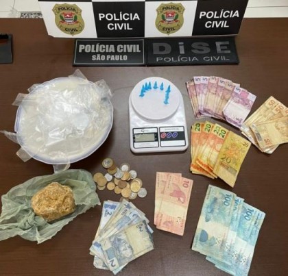 Em uma casa à rua Assur Bitencourt foi apreendido um tijolo de crack, porções de cocaína, dinheiro e material utilizado para embalar a preparar a droga.