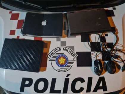 No exame do saco deixado para trás, foram encontrados três notebooks Dell, um deles danificado, além de dois mouses e uma camiseta azul cobrindo os itens. Esses equipamentos foram identificados como produtos de um furto ocorrido em 11 de novembro de 2024.
