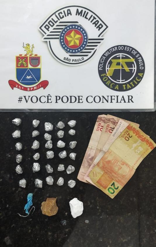 Quando foi abordado, um dos suspeitos dispensou uma sacola fora, que foi apreendida. Dentro da sacola havia 31 porções de crack, uma pedra bruta de cocaína e outra de crack.