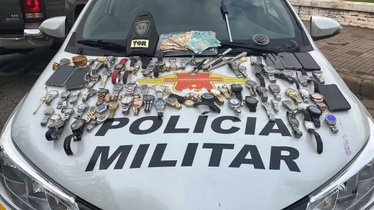 A princípio, o grupo não obedeceu à ordem de parada, mas acabou sendo abordado durante a tentativa de fuga. Os policiais vistoriaram o veículo e encontraram uma grande quantidade de relógios, celulares e dinheiro.