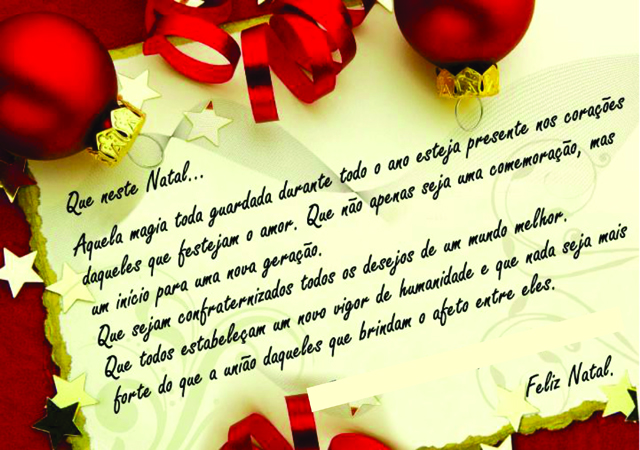 Que este Natal e Ano Novo sejam mais do que confraternizações porque todos os momentos, em especial este novo ano, deverão ser iluminados, abençoados e que os 365 dias, sejam vividos na sua totalidade. Já que Natal significa: NASCER, nasçamos então dia 25, para que os doze vinte e cinco vindouros, sejam a busca da paz, conquista, compreensão, reflexão, prosperidade. Feliz Natal e Ano Novo!