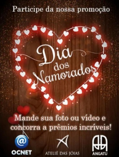 Os participantes da promoção de Dia dos Namorados do portal Ocnet estarão concorrendo a um jantar especial, que será realizado no domingo, 12 de junho, Dia dos Namorados no Angatú Hotel, além de um presente surpresa do Ateliê das Jóias.