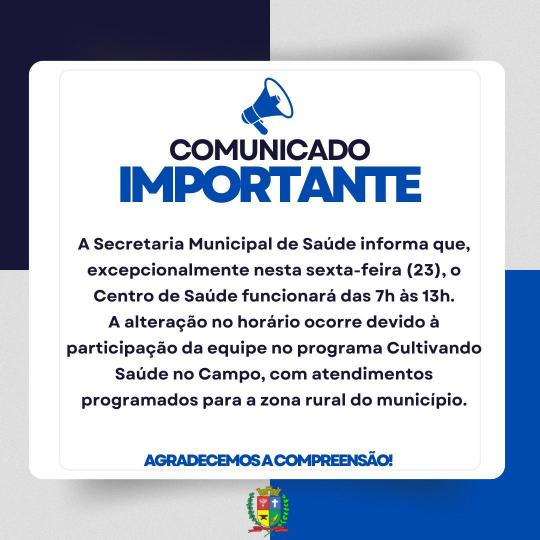 OSVALDO CRUZ - A Secretaria Municipal de Saúde informa que, excepcionalmente nesta sexta-feira (23), o Centro de Saúde funcionará das 7h às 13h.