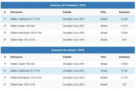 OSVALDO CRUZ - As rádios Califórnia FM e Clube AM ambas do grupo Borini de rádio são as líderes de audiência pela internet por mais um mês. O fato é relevante porque é cada vez maior a convergência de audiência de mídias pela internet, principalmente devido ao uso de dados móveis e smartophones, o que se confirmou também em fevereiro de 2019.