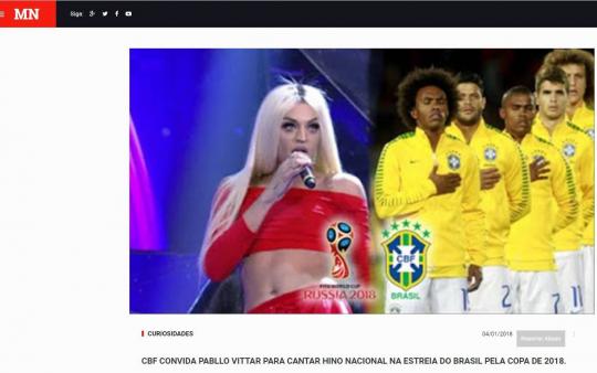 NACIONAL - O boato sobre uma participação frustrada da cantora Pabllo Vittar antes da fama no programa Ídolos, da TV Record, não foi o único sobre ela na primeira semana do ano. Circula nas redes sociais desde o último dia 4 de janeiro a lorota de que Pabllo foi convidada pela Confederação Brasileira de Futebol (CBF) e aceitou interpretar o Hino Nacional na estreia da seleção brasileira na Copa do Mundo, em junho, na Rússia.