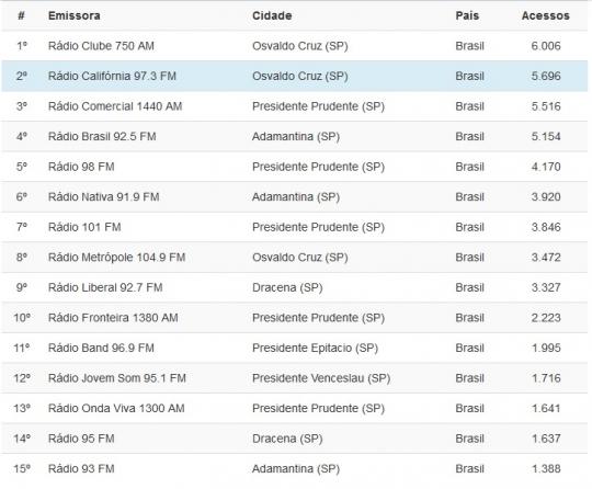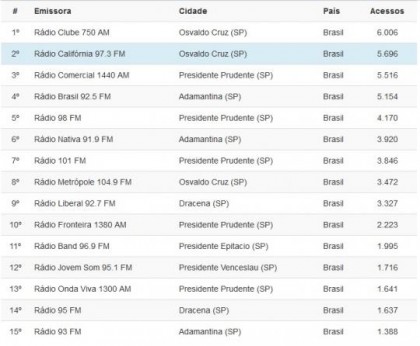 Logo atrás está a Califórnia FM com 5.696 acessos e em seguida a Rádio Comercial AM de PResidente Prudente com 5.516.